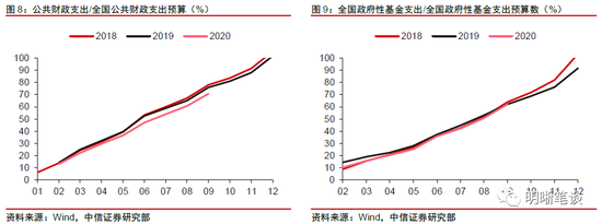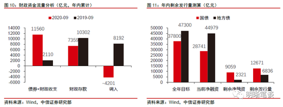 今年财政支出进度相对较慢。今年全年公共财政支出预算共计24.785万亿元,当前公共财政支出总额完成进度为70.68%,明显低于往年;今年全国政府性基金预算支出预算共计约12.61万亿元,当前政府性基金支出总额完成进度为62%,进度同往年基本持平。截止2020年9月,全国公共财政支出单月增速仍为负,如果希望在年内完成支出预算,则四季度单季财政支出增速可能要达到大约28.3%。从过往经验看,达到该增速目标是有难度的,进入冬季天气逐渐转冷造成一些不利影响(考虑到政府性基金支出进度较为正常,天气影响因素可能较小)。从财政资金流量看,今年财政支出相较融资进度慢,使得从前9个月看财政资金总体上还尚未使用调入资金净额(今年财政调入资金预算在3万亿元左右),为四季度完成预算任务增加了一定的难度。综上所述,从大方向来看,四季度财政部门为了完成支出任务预计将更多地投放财政资金,但是财政支出完成的任务仍然存疑。我们提示大家关注财政资金的投放进度以及政府债融资进度,如若财政投放不及预期可能会影响债市流动性。