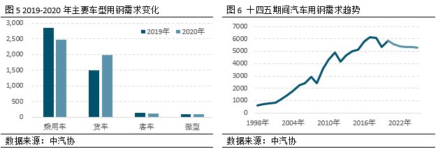 “十四五”期间中国汽车行业仍面临较大的增长压力,预计汽车用钢需求将呈现下滑趋势,“十四五”末汽车用钢将回落至5300万吨水平,与2019年相当。