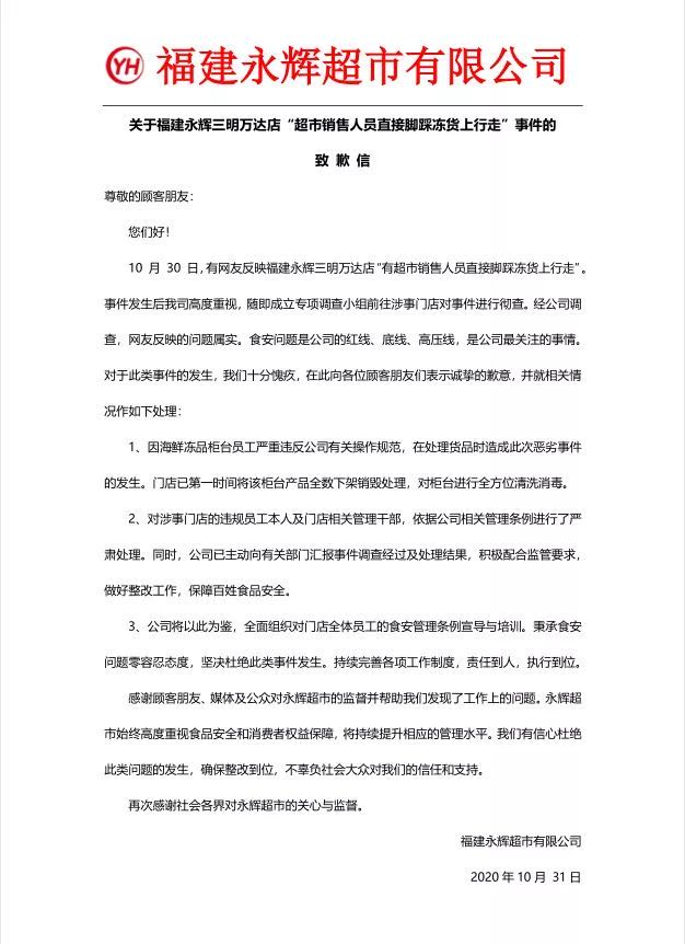 11月1日下午,媒体记者致电福建永辉三明万达店,该店员工表示,声明确系公司总部发出。声明提到,对于有网友反映福建永辉三明万达店“超市人员直接脚踩冻货上行走”,经核实,网友反映问题属实。