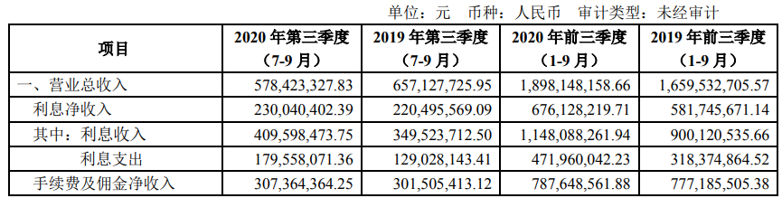 其中,2020年第三季度,利息净收入2.30亿元,较上年同期增长4.33%;手续费及佣金净收入3.07亿元,较上年同期增长1.94%。