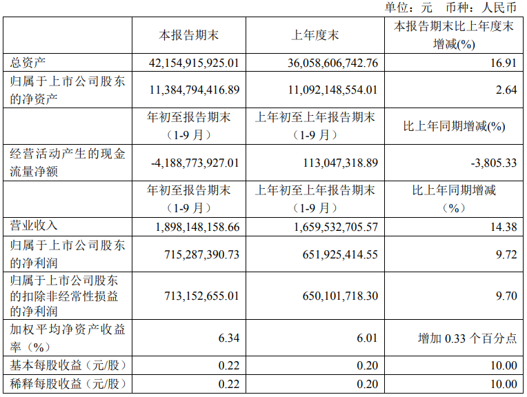 报告期末,南京证券总资产421.55亿元,较上年度末增长16.91%。2020年1-9月,南京证券实现营业收入18.98亿元,较上年同期增长14.38%;实现归属于上市公司股东的净利润7.15亿元,较上年同期增长9.72%;实现归属于上市公司股东的扣除非经常性损益的净利润7.13亿元,较上年同期增长9.70%;经营活动产生的现金流量净额为-41.89亿元,较上年同期减少3805.33%;加权平均净资产收益率(ROE)6.34%,较上年同期增加0.33个百分点。