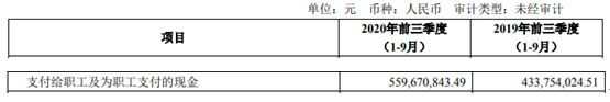 2020年1-9月,南京证券支付给职工及为职工支付的现金为5.60亿元,去年同期为4.34亿元。