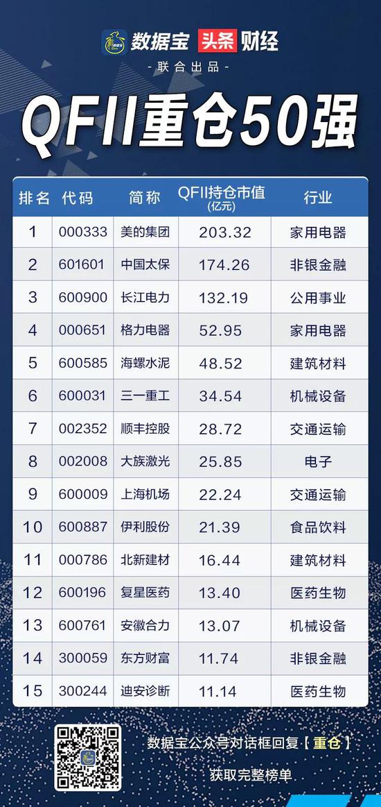 证券时报·数据宝推出《QFII重仓50强》名单,3股获QFII持仓市值超百亿。文末有彩蛋,中奖率高。