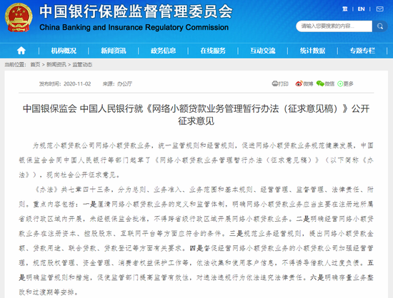 11月2日,银保监会会同央行发布《网络小额贷款业务管理暂行办法(征求意见稿)》(下称《办法》),规范小额贷款公司网络小额贷款业务,统一监管规则和经营规则。