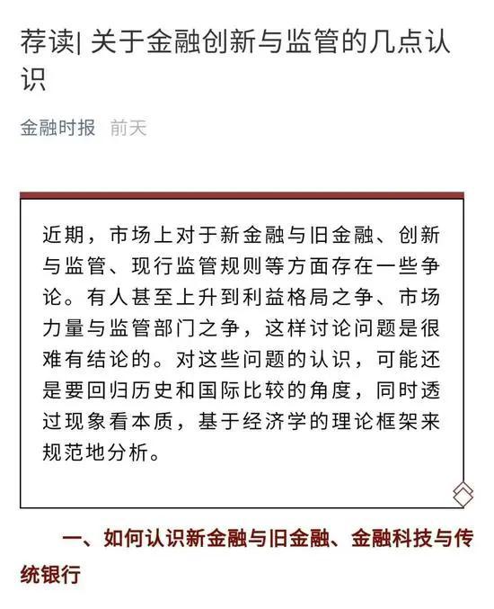 10月31日,《金融时报》转载刊发《关于金融创新与监管的几点认识》一文。11月1日,该报再次刊发标题为《资深学者:大型互联网企业进入金融领域的潜在风险与监管》的文章。11月2日下午,该报再次撰文《资深学者:在金融科技发展中需要思考和厘清的几个问题》。