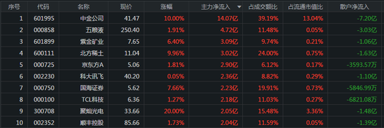 从个股来看,主力资金最青睐的3只股票分别是中金公司、五粮液、紫金矿业,流入金额分别为14.07亿元、4.72亿元、3.09亿元,所对应的涨幅分别为10.00%、1.91%、6.40%。