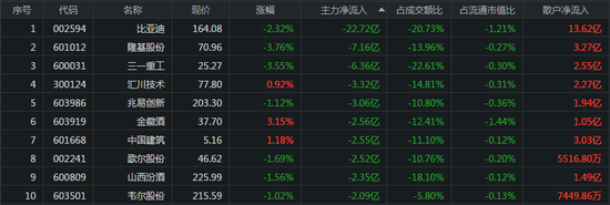 从个股来看,比亚迪、隆基股份、三一重工分别遭主力资金卖出22.72亿元、7.16亿元、6.36亿元。