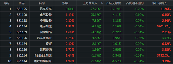 主力资金流出的板块分别是汽车整车、电气设备、专用设备,主力资金流出金额分别为27.29元、25.16亿元、7.89亿元,其中散户净流入金额为11.76亿元、6.45亿元、2.84亿元。