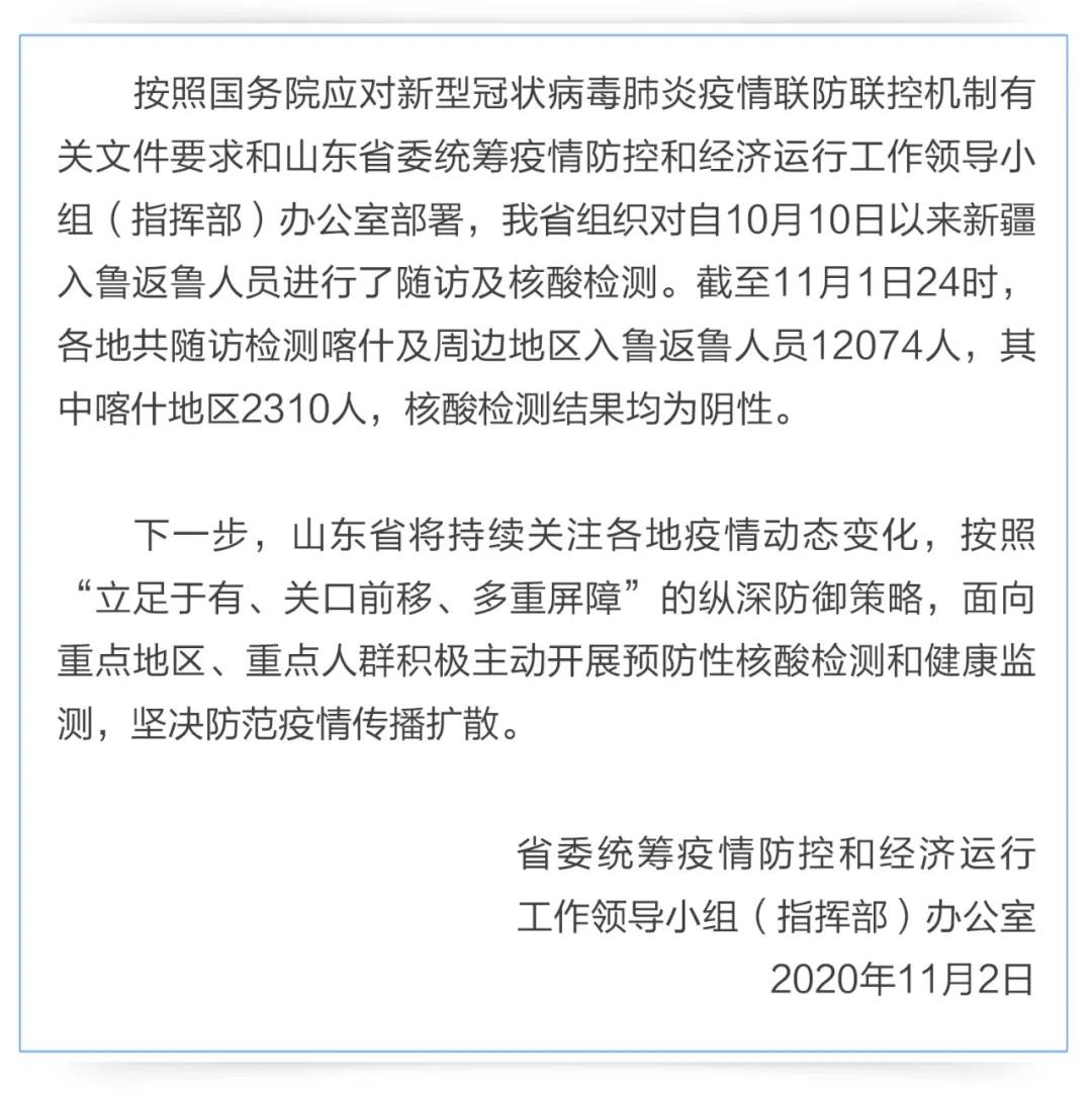 按照国务院应对新型冠状病毒肺炎疫情联防联控机制有关文件要求和山东省委统筹疫情防控和经济运行工作领导小组(指挥部)办公室部署,山东省组织对自10月10日以来新疆入鲁返鲁人员进行了随访及核酸检测。截至11月1日24时,各地共随访检测喀什及周边地区入鲁返鲁人员12074人,其中喀什地区2310人,核酸检测结果均为阴性。