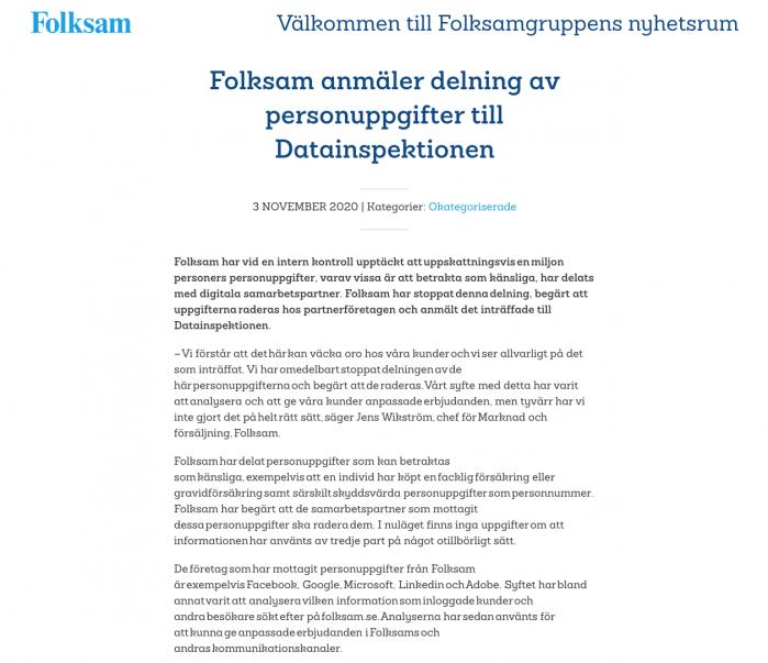 Folksam分享了可能被视为敏感的个人数据,例如,某人购买了工会保险或怀孕保险,以及特别值得保护的个人数据——个人社会保险号。Folksam已要求已收到个人信息的合作伙伴将其删除。当前,没有信息表明该信息已被第三方以任何不当方式使用。从Folksam接收个人数据的公司有Facebook,Google,Microsoft,Linkedin和Adobe。