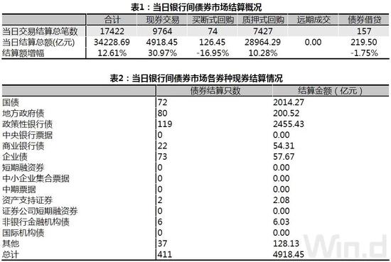 11月4日,全国银行间债券市场结算总量为34228.69亿元,较上日增长12.61%,交易结算总笔数为17422笔。其中,质押式回购28964.29亿元,买断式回购126.45亿元,现券交易4918.45亿元,债券借贷219.50亿元。银行间债券市场回购利率整体下行,其中,隔夜回购利率下行41.5bp至1.445%。