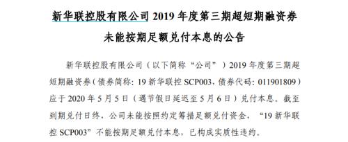 事实上,新华联控股年内已有多只债券违约。5月6日,新华联控股曾公告称,截至当日,19新华联控SCP003的兑付日,公司未能按照约定筹措足额兑付资金,该债券构成实质性违约。