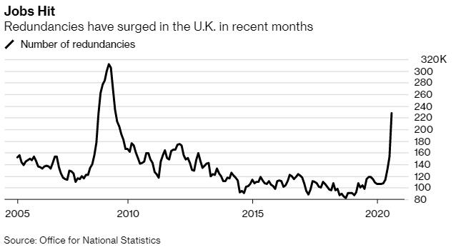 即便还没有公布新的封锁措施,截至8月份的3个月里,英国失业人数也创下了有记录以来的最大增幅。而这只是日益脆弱的经济复苏的一部分。英国经济在8月份表现不佳,这意味着经济增长不太可能达到英国央行此前对第三季度增长18.3%的预期。彭博经济预计,新的封锁可能导致第四季度经济萎缩3%。
