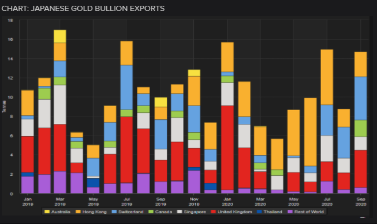 9月份,日本黄金主要出口至瑞士和英国,对这两个国家的出口量占总出口量的60%,中国香港、新加坡和加拿大占据剩余的大部分出口。