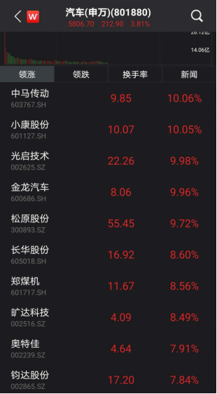 早盘表现优异的除了白酒,还有汽车板块和5G概念。领涨两市的汽车板块中,中马传动、小康股份、光启技术、金龙汽车午盘涨停,松原股份、长华股份、郑煤机、旷达科技等涨幅也超过了8%。