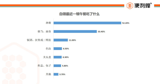 超五成白领最近一顿午餐吃了便利蜂的热餐,超三成吃了便当、面食,另有11%的人选择了饭团、汉堡和三明治等鲜食,就连炸品、包子和关东煮等早餐或宵夜类食品也出现在不少人的午餐清单里。
