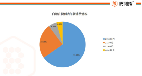 便利蜂综合各地情况,65.2%的消费者午餐费用控制在20元以内,其次是21-30元,占比24.7%,仅有差不多10%的消费者平均午餐费用在30元以上。