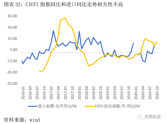 PMI本质上是一个环比数据,我们可以将PMI新出口订单指数转化为虚拟同比,然后再与出口当月同比进行比较。进口同理。