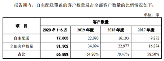 再看客户数量。招股说明书在“物流配送模式”中分析自主配送覆盖的客户数量情况时显示,2017-2020年上半年,合纵药易购的全部客户数量分别为16874家、22977家、34094家和31302家。