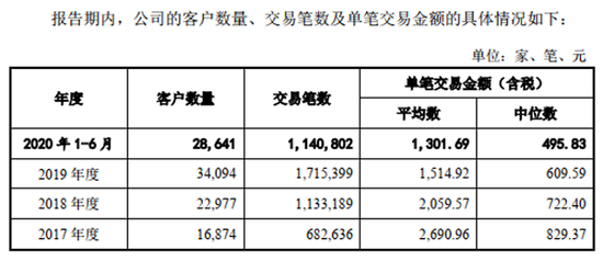 可是,招股说明书在“公司交易特点概述”中却又披露,报告期内,公司的客户数量分别为16874家、22977家、34094家和28641家。