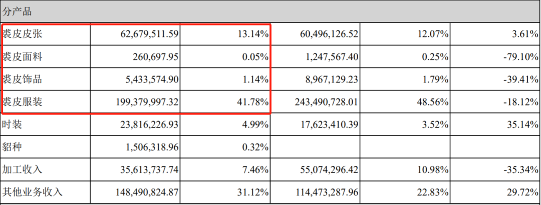 从2019年年报数据来看,裘皮服装、裘皮饰品、裘皮面料、裘皮皮张等业务实现营收2.68亿元,占当年总营收的56.11%.