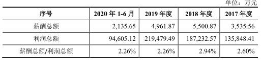 2017年至2020年1-6月,华利股份董监高的薪酬总额分别为3535.56万元、5500.87万元、4961.87万元、2135.65万元,占当期利润总额的比例分别为2.60%、2.94%、2.26%、2.26%。