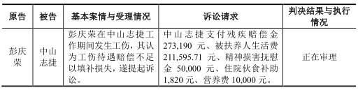 招股书称,彭庆荣曾于工作期间发生工伤,华利股份子公司中山志捷已予以补偿,但该名员工对补偿金额存有异议,因而提起上述诉讼。