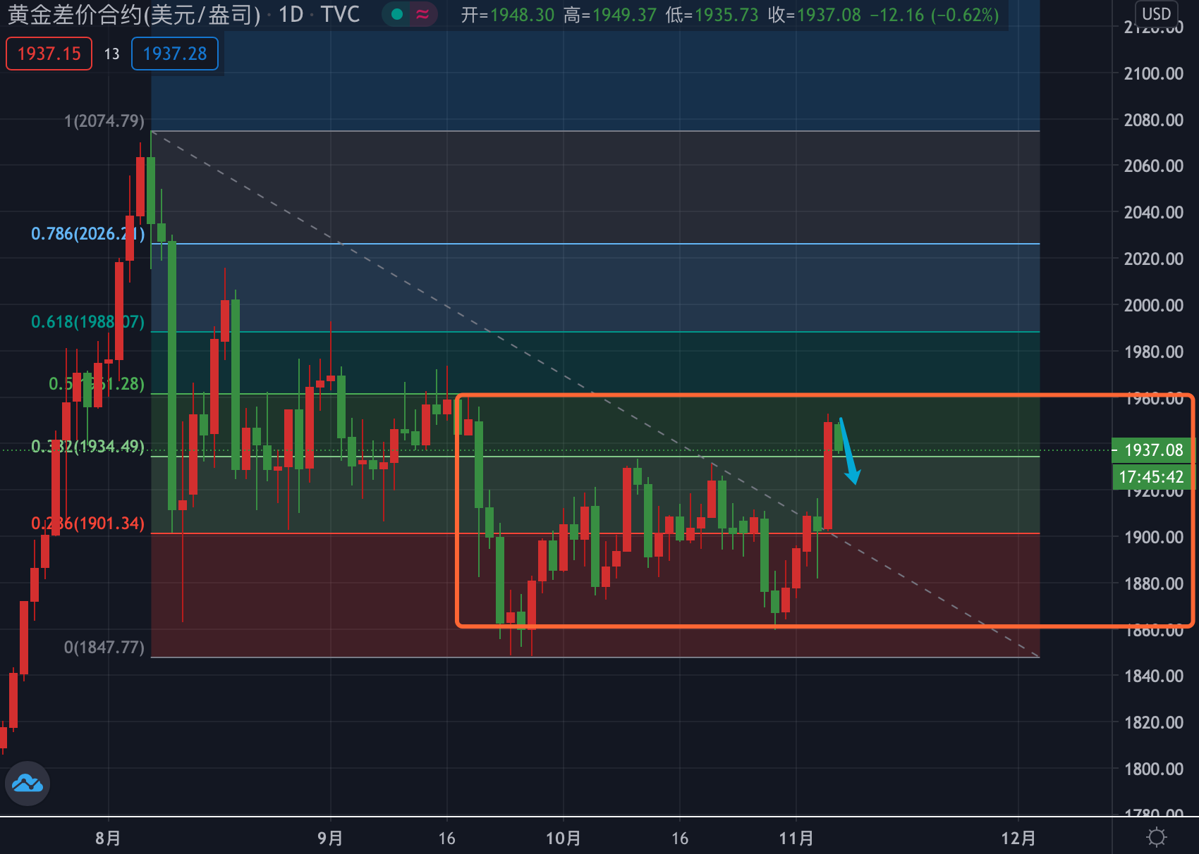 黄金多头昨天强势反弹,美盘时段直接拉到了我们之前说的大选期间金价天花板位置1950,也是9月21日第二轮100多美金下撤的起跌点附近,金价昨天在起跌点附近遇阻,与前方形成双顶,因此虽然现在盘面上多头占主导,但追多并不是明智的选择。昨天强势的买盘并没有突破1950,那么也不能说黄金走出了单边,就像8月12日和9月21的大幅下撤,下方没有突破1860,也不能说黄金向下走出单边一样,现在去追多,就像1860去追空一样,强关口去追,容易被困。