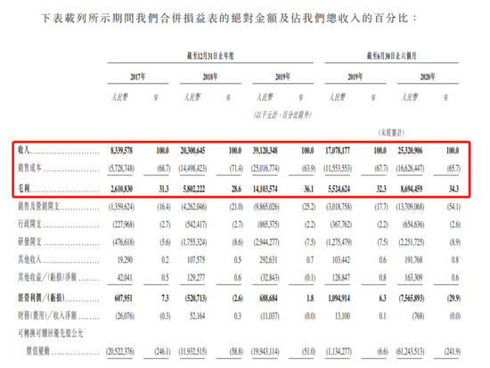 根据招股书,2017年、2018年、2019年公司总收入分别为83亿元、203亿元、391亿元。2020年上半年,公司实现收入253亿元,同比增长48%。