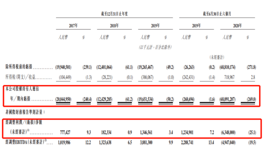 2017年到2019年,公司分别实现归属股东应占亏损分别为200.45亿元、124.29亿元、196.51亿元。2020年上半年,公司实现亏损680.91元,较2019年同期的2.69亿巨幅扩大。由于2020年亏损主要是因为可转换优先股大幅增加612亿。根据调整后净利来看,公司2020年中期净利润为63.48亿元,较去年同期的123亿元盈利大幅减少180多亿。
