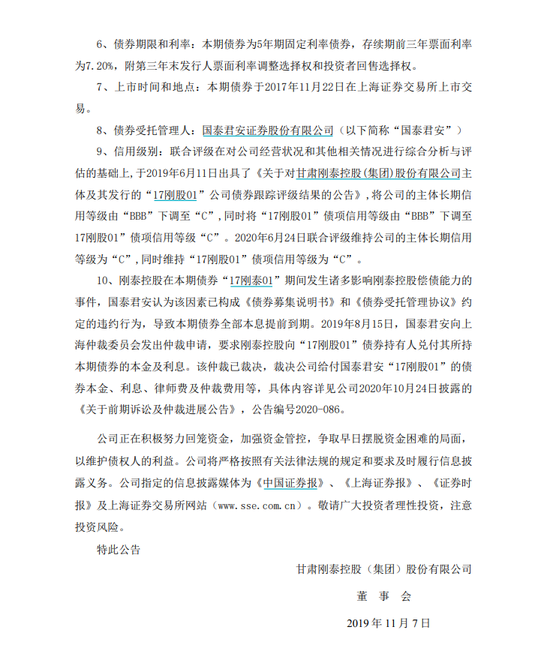 11月6日,*ST刚泰公告,公司2017年11月8日公开发行公司债券(“17刚股01”)需于2020年11月9日兑付2019年11月8日至2020年11月9日期间的债券利息。经公司多次研究讨论,因目前资金面尚未明显好转以及多家银行账户被冻结等原因,资金困难,到2020年11月9日暂无法兑付该笔债券利息。
