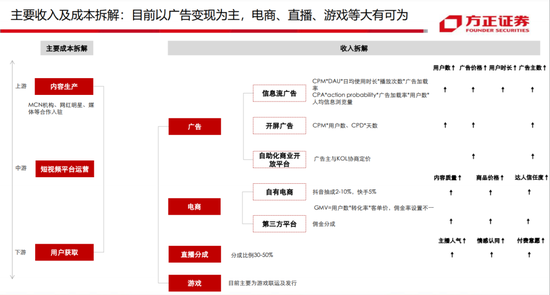 方正证券认为,目前短视频平台收入以广告为主,未来电商、直播、游戏等大有可为。