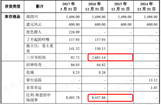 另外,还有3部已经躺在库存中多年的分别是《神秘宝藏》、《A测试之爱情大冒险》、《鬼吹灯》。《鬼吹灯》是一部话剧且金额较小,前2部电影分别于2014、2015年出品,然而至今仍未上映,公司也没有计提跌价准备。