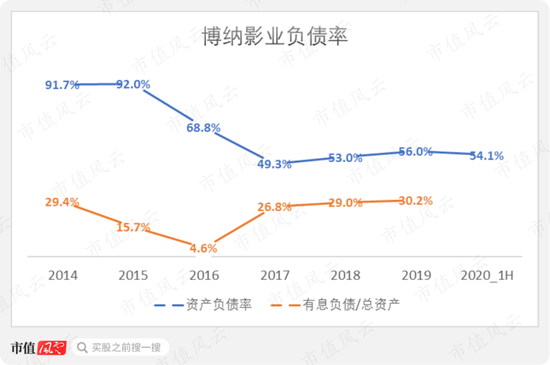 截至2019年末,博纳影业的资产负债率是56.0%,有息负债占总资产的比例是30.2%。今年上半年资产负债率略有下降。