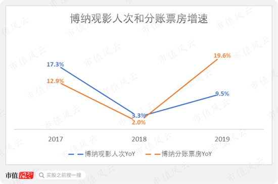 同时期,博纳的观影人次和分账票房增速先降后升,2019年增速分别达到9.5%、19.6%,快于市场整体增速。