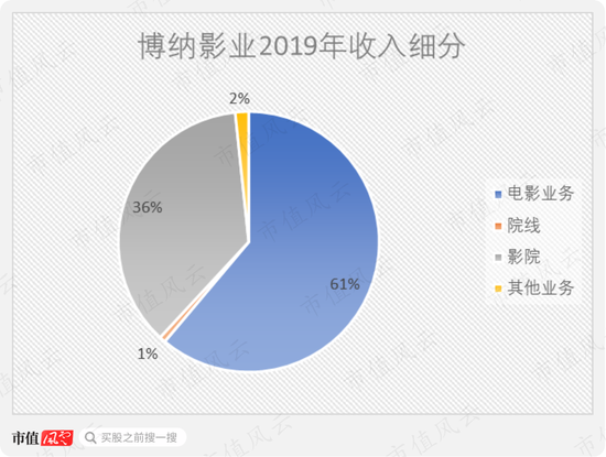 把博纳的收入拆开来看,占比最多的是电影业务,达到61%;然后是影院业务,占比36%;院线业务是2019年开始的新业务,仅占1%。