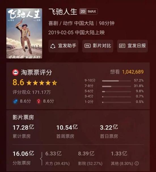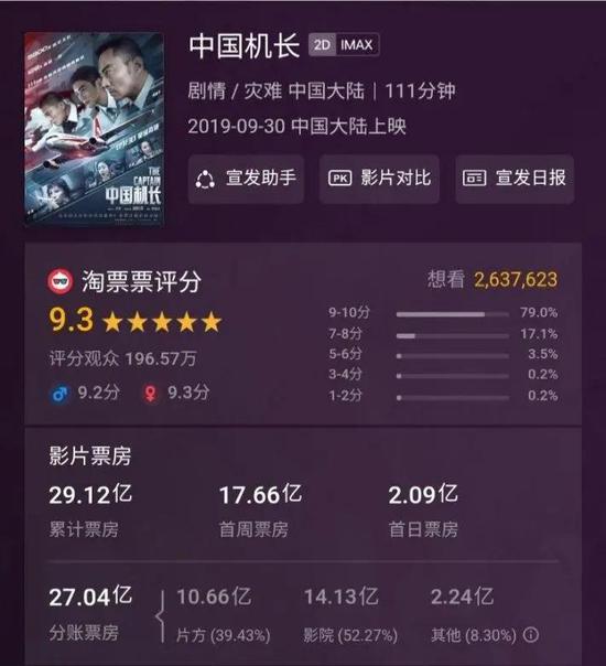 以主投影片《中国机长》为例,票房总计29.12亿。这当中,分给片方的只有10.66亿,占总票房的39.4%,52.3%的票房则是分给了影院,这两个比例都是固定的。