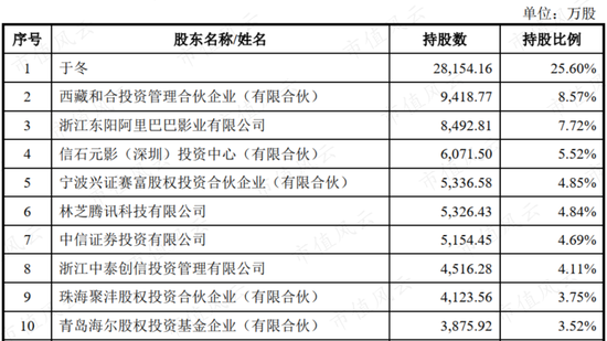 其他知名股东还有浙江东阳阿里巴巴影业,持股7.72%;林芝腾讯科技,持股4.84%;中信证券投资,持股4.69%;青岛海尔股权投资基金企业,持股3.52%。