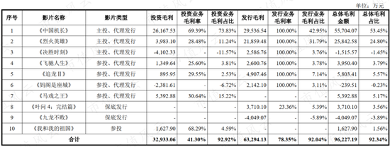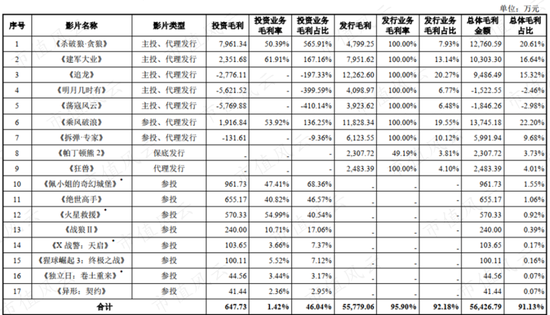 即使按更广义的范围(注:加上参投但不是发行方的国内影片)算,近三年纯投资电影所贡献的毛利分别占到投资业务毛利的193.1%、12.4%、4.6%。