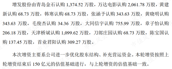 2017年3月,博纳影业整体变更为股份有限公司。紧接着进行的一轮增发中,估值达到150亿元,并引入了万达电影(002739.SZ)、韩寒、张涵予、黄晓明、章子怡等明星股东。