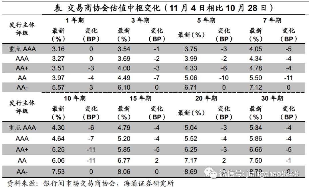 相比10月28日协会估值,本周(11月4日)中信用债估值收益率下行为主。