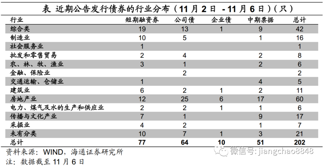 从主要发行品种来看,本周共发行短融超短融77只,中期票据51只,企业债发行10只,公司债发行64只,发行数量较前一个交易周减少。从发行人资质来看,AAA等级发行人占比最大为53%。从行业来看,房地产行业发行人占比最大为30%,其次为综合类行业发行人,占比为21%。在发行的202只主要品种信用债中有41只城投债,占比约20.3%,发行数量比前一周有所减少。