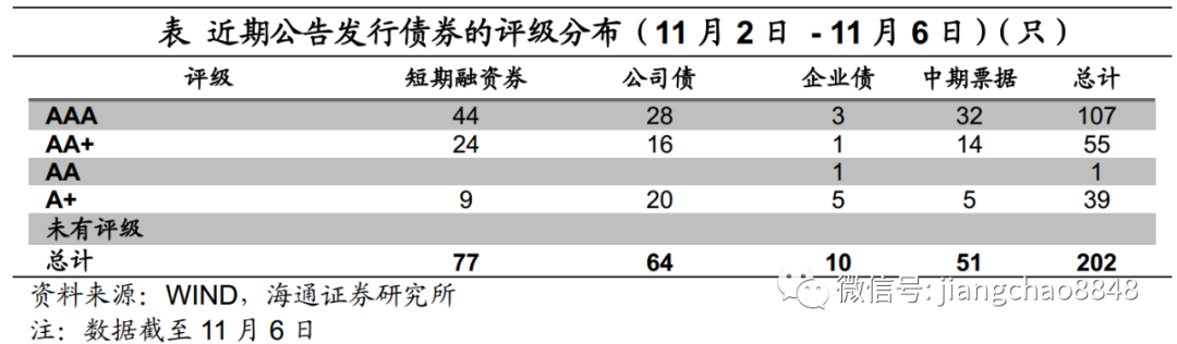 信用债等级利差基本持平。具体来看,截至11月6日,1年期短期品种AA级与AAA级中票利差为26BP,与上周基本持平;3年期AA级与AAA级中票利差为34BP,较上周末下行1BP;5年期AA级与AAA级中票利差为55BP,与上周基本持平。