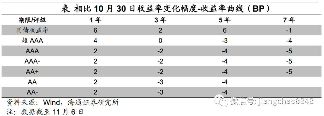 信用债期限利差收窄。具体来看,截至11月6日,5年期和3年期的AAA中票期限利差为31BP,较上周末下行2BP;5年期和3年期的AA中票期限利差为52BP,较上周末下行1BP;5年期和1年期AAA中票的期限利差为68BP,较上周末下行5BP。