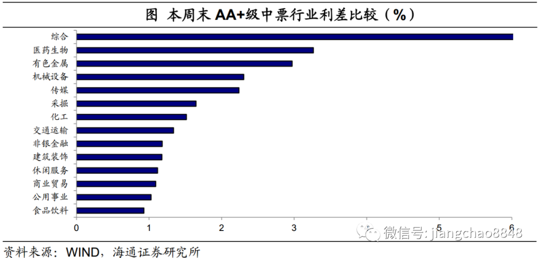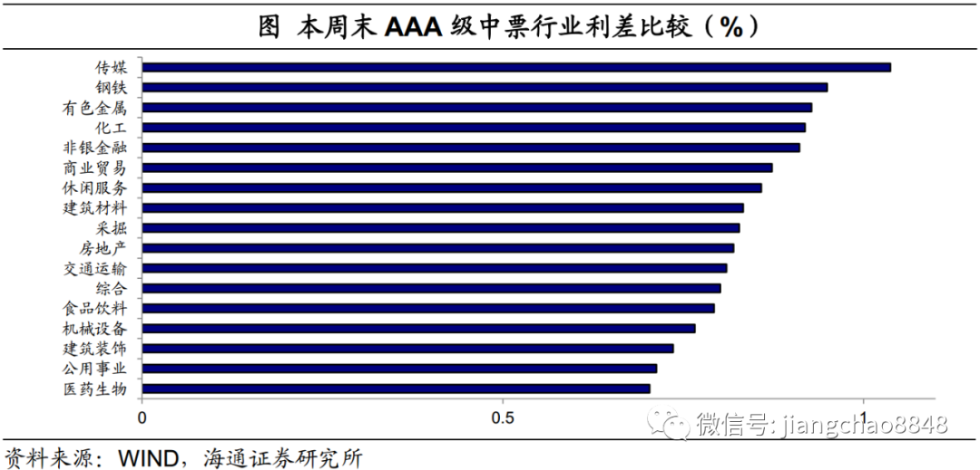 高等级债中,传媒、钢铁是利差最高的两个行业。AAA级传媒行业中票平均利差为104BP,AAA级钢铁行业中票平均利差为95BP。其次是有色金属、化工、非银金融和商业贸易行业,其利差均在90BP左右。医药生物是平均利差最低的行业,目前为70BP。