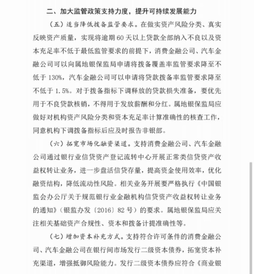 《通知》指出要加大监管政策支持力度,并释放出三个利好消息:一是适当降低拨备监管要求。允许消金公司、汽车金融公司向属地银保监局申请将拨备覆盖率监管要求降至不低于130%,汽车金融公司可以申请将贷款拨备率监管要求降至不低于1.5%。
