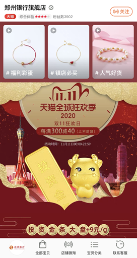 例如,“双十一”期间,郑州银行天猫旗舰店整体跨店满300减40活动, 上不封顶 (金条、熊猫币、人民币不参加);使用花呗付款可享受3期免息、6期免息 (金条、熊猫币、人民币不参加);成功下单饰品、文创产品达3000元,免费附赠牛年银钞或人民币发行70周年纪念钞一张,满5000元免费附赠牛年金钞一张。同时,“双十一“当天,还为消费者准备了两款单价8块8的银镯等。