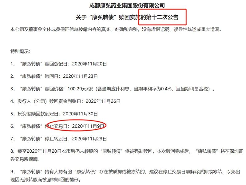 随后,康弘药业共进行了高达十二次的提前赎回公告,提示相关风险,引导投资者转股。