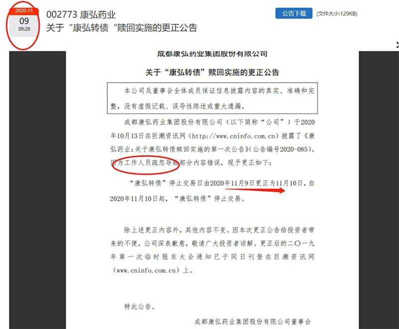 “康弘转债”停止交易日由2020年11月9日更正为11月10日,自2020年11月10日起,“康弘转债”停止交易。
