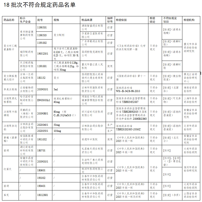 对上述不符合规定药品,药品监督管理部门已要求相关企业和单位采取暂停销售使用、召回等风险控制措施,对不符合规定原因开展调查并切实进行整改。